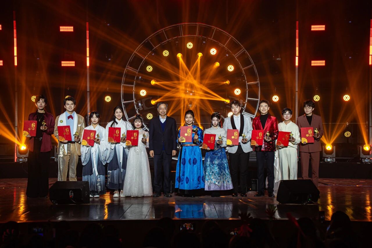 校党委书记潘一山为“声耀辽大 逐梦芳华”辽宁大学2025年校园歌手大赛总冠军商学院乌日图那顺颁奖。